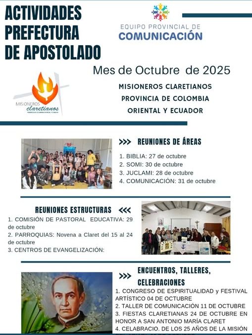 Compartimos con ustedes las diversas actividades que se desarrollarán en este mes, que en nuestro caso resalta la memoria de nuestro fundador San Antonio María Claret